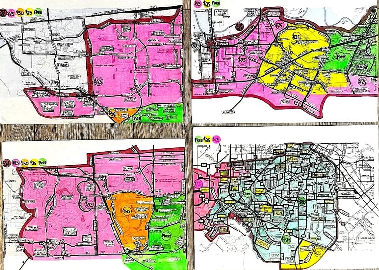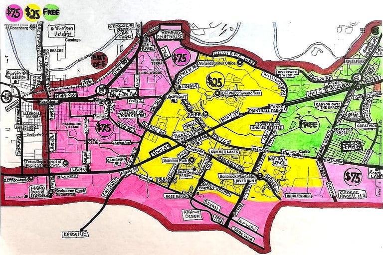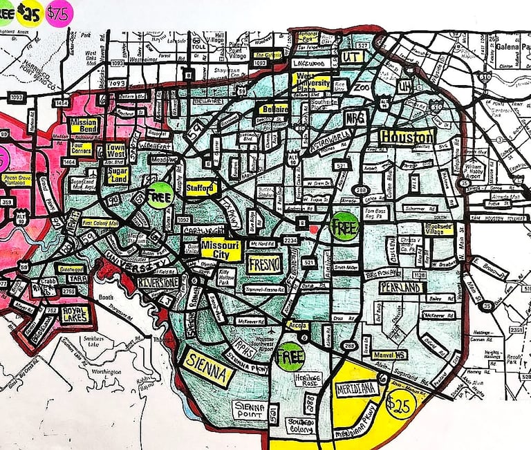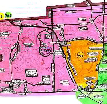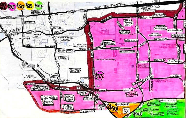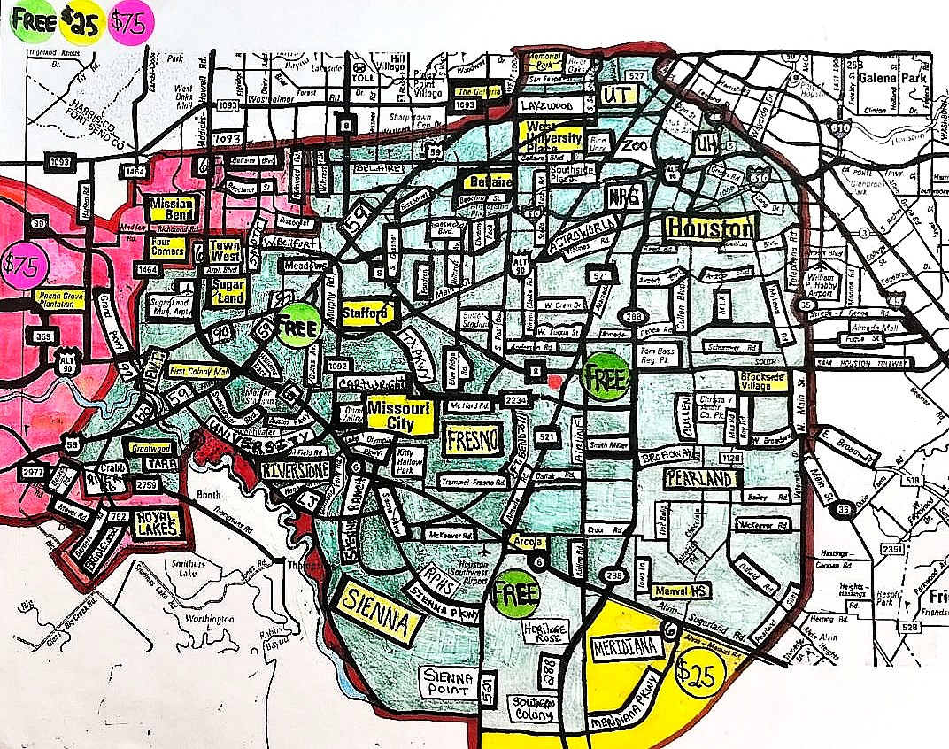 *As vast as these areas are, there IS a DELIVERY FEE to the following SPECIFIC AREAS/NEIGHBORHOODS/ZIP CODES which fall outside our circle of free delivery within Houston, Richmond/Rosenberg and Arcola/Alvin/Manvel/Iowa Colony/Rosharon/Pearland/Brazoria and Fort Bend County.