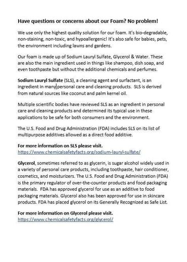**FOAM IS NON-TOXIC, NON-STAINING, SCENT FREE, HYPOALLERGENIC, BIO-DEGRADABLE AND WILL NOT BURN THE EYES.