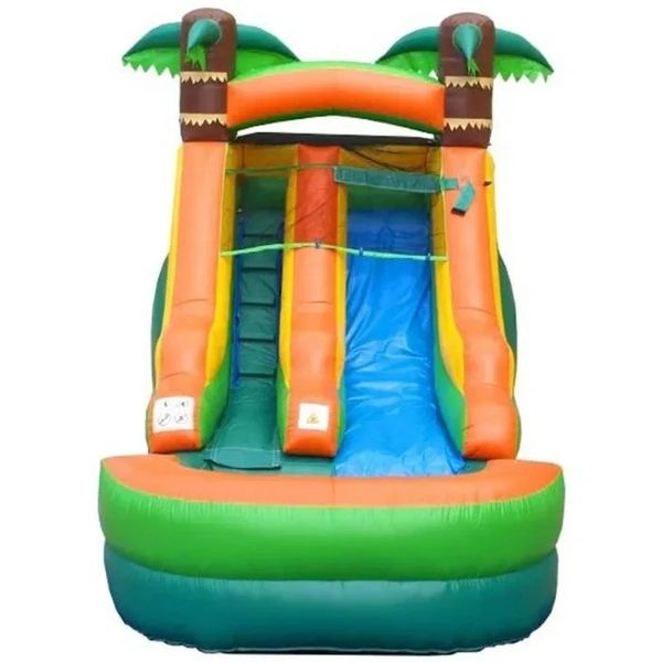 FOR CHILDREN UNDER 10 ONLY. Can be used wet or dry. Please specify, so we can bring the appropriate attachments. It features two "non-scary" 5 ft. slide-drops and large jump area. Perfect for small children. Water pours overhead both slides as they slide down to a long landing.